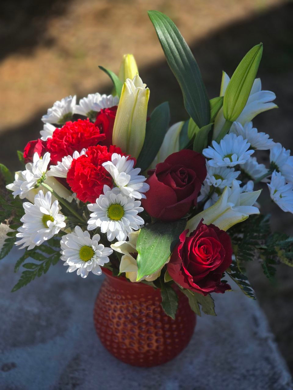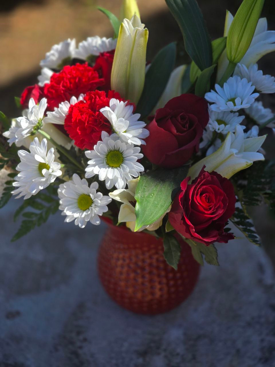 The second red accent is the red carnation. This flower is often overlooked, but in professional floristry, the carnation is prized for its remarkable resilience and graceful form. Its softly serrated double petals add textured variety to the arrangement. A red carnation symbolizes leadership, loyalty, and genuine affection.