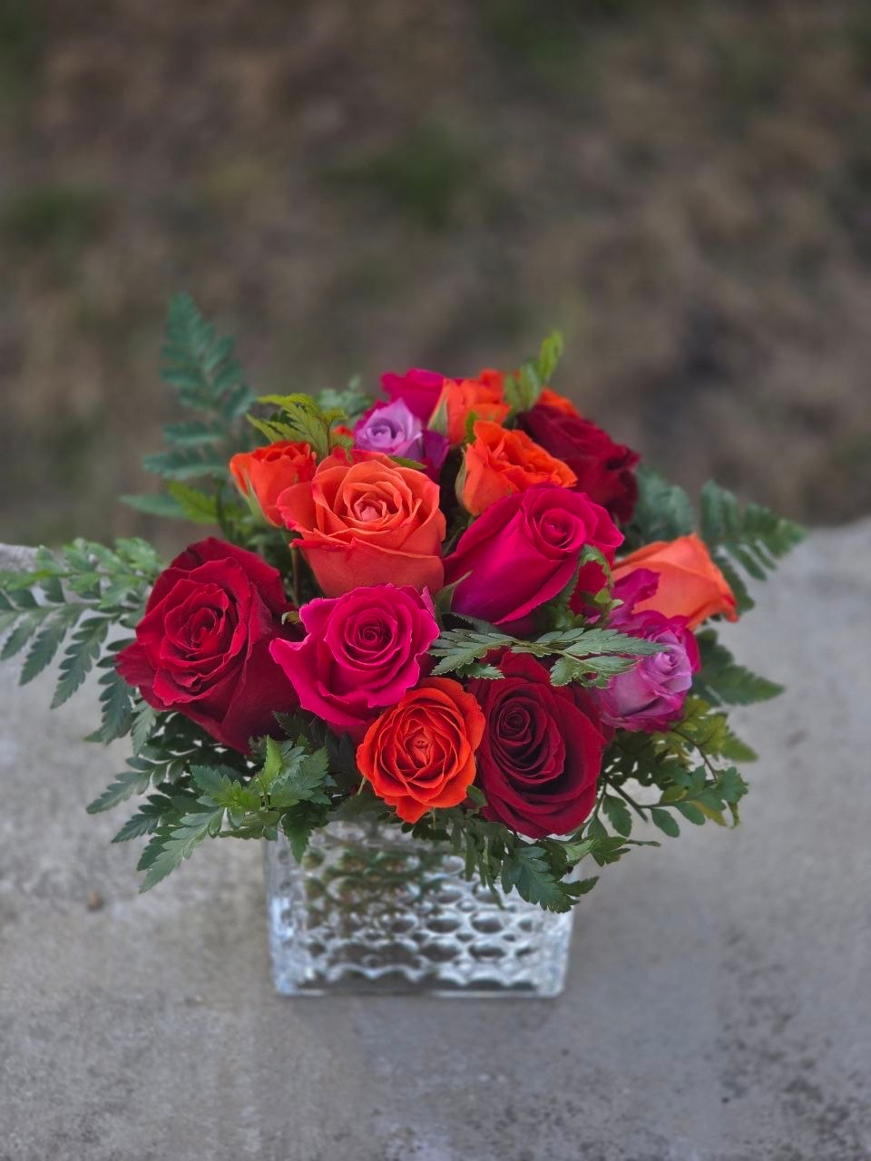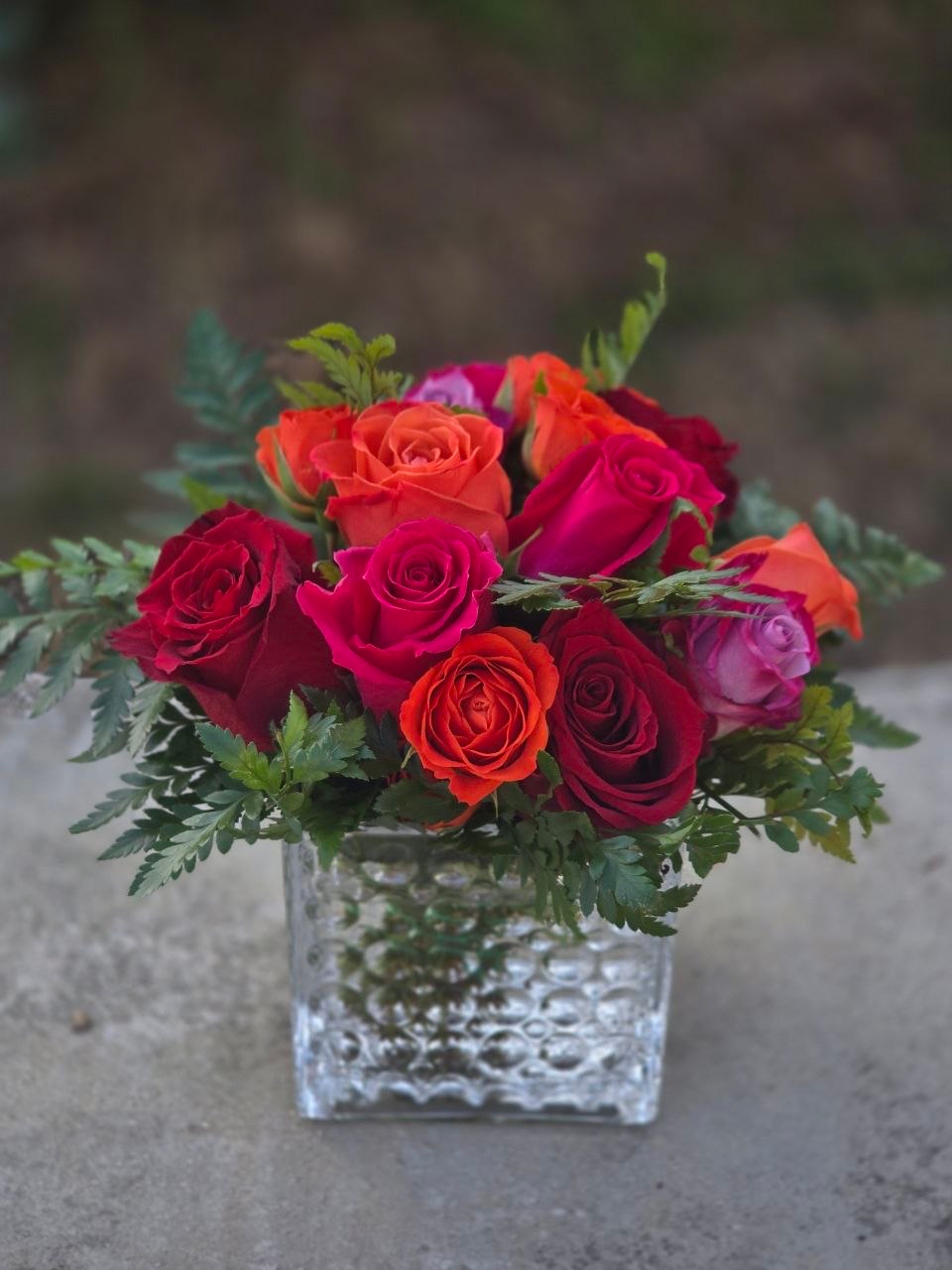 The highlight of this arrangement is the three roses, each in a different yet harmoniously complementary color. Each carries its own meaning and evokes its own emotion.