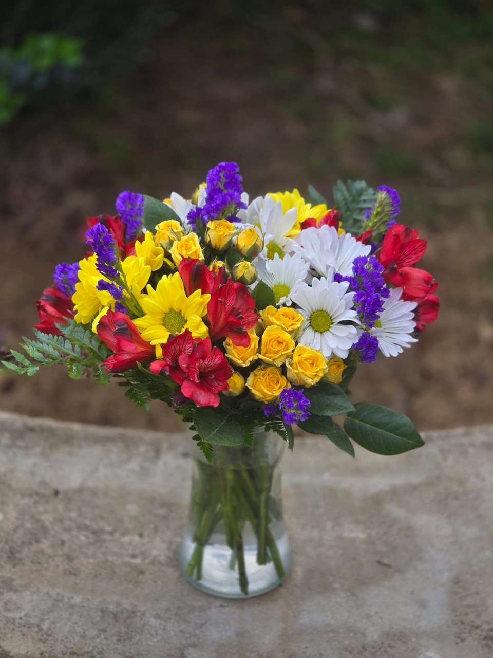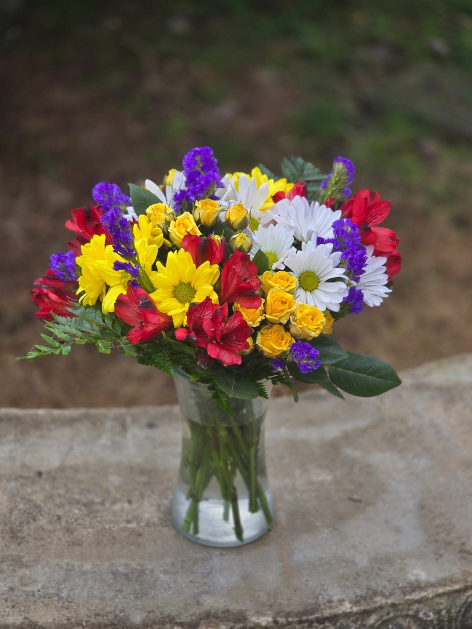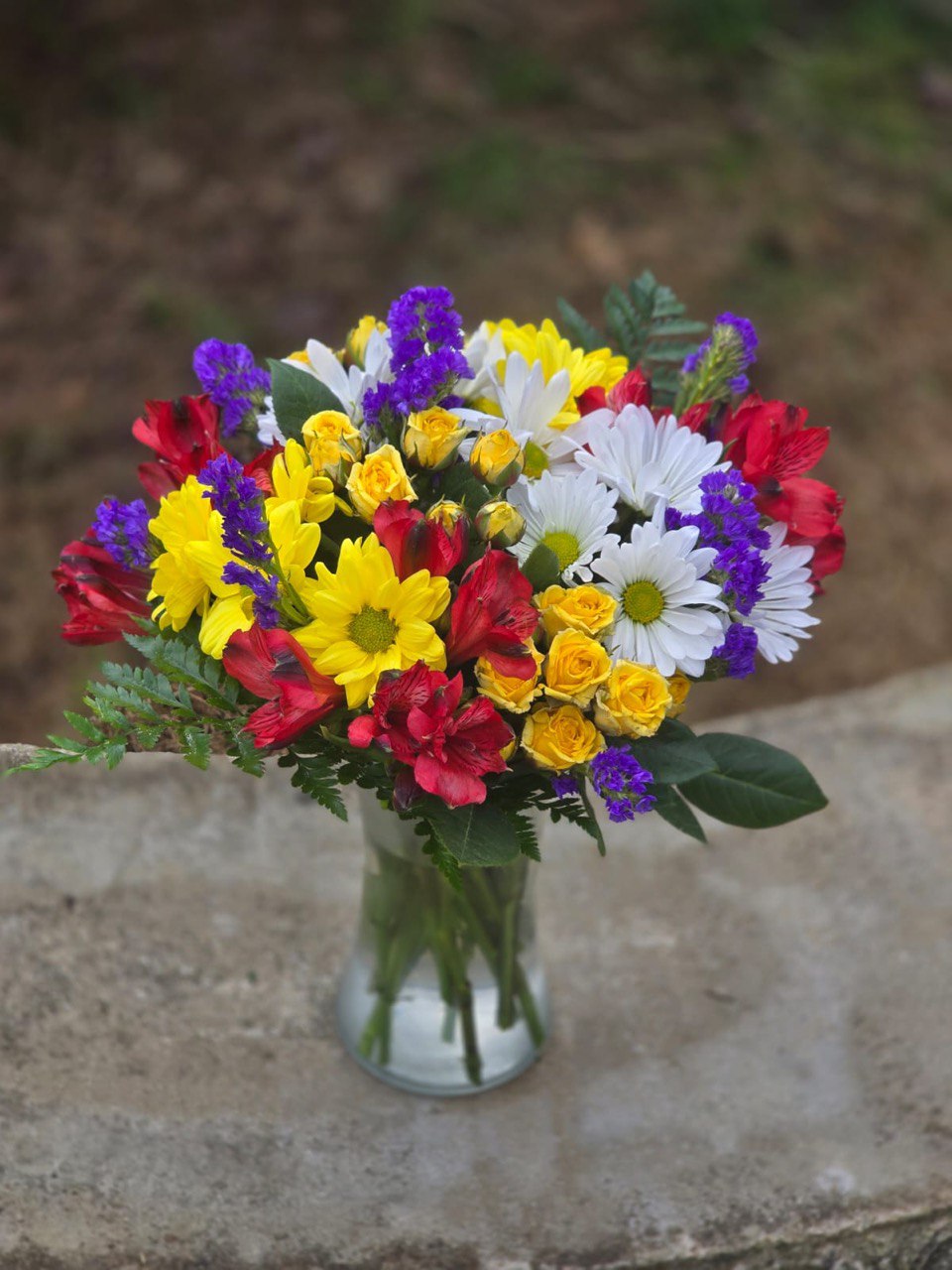 For a friend or colleague. Yellow roses and chrysanthemums symbolize friendship and sincere affection. Alstroemeria also represents friendship and support.