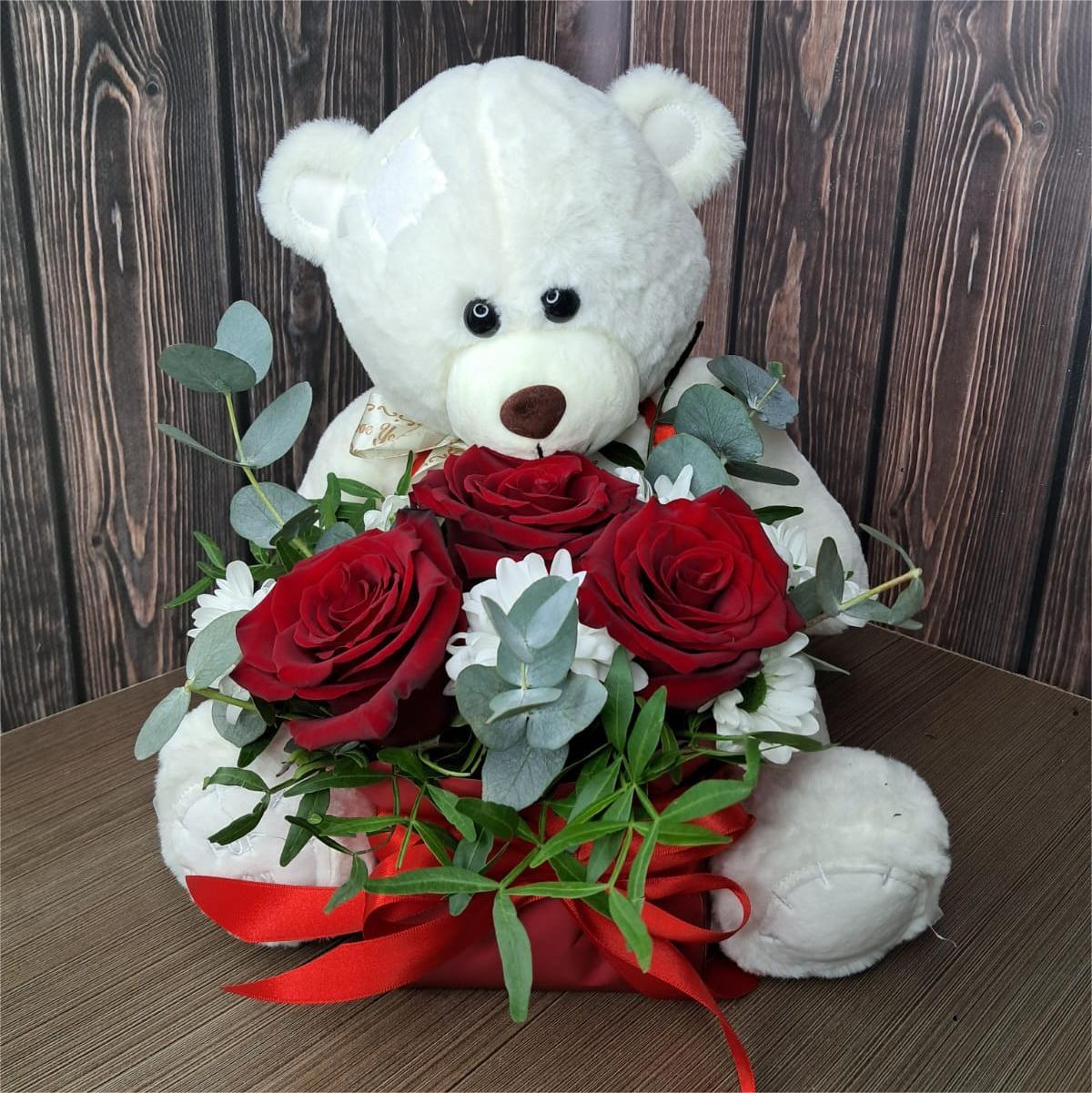 A bouquet compliment with a bear and roses is a bright and touching combination, ideal for expressing feelings of a pleasant mood.