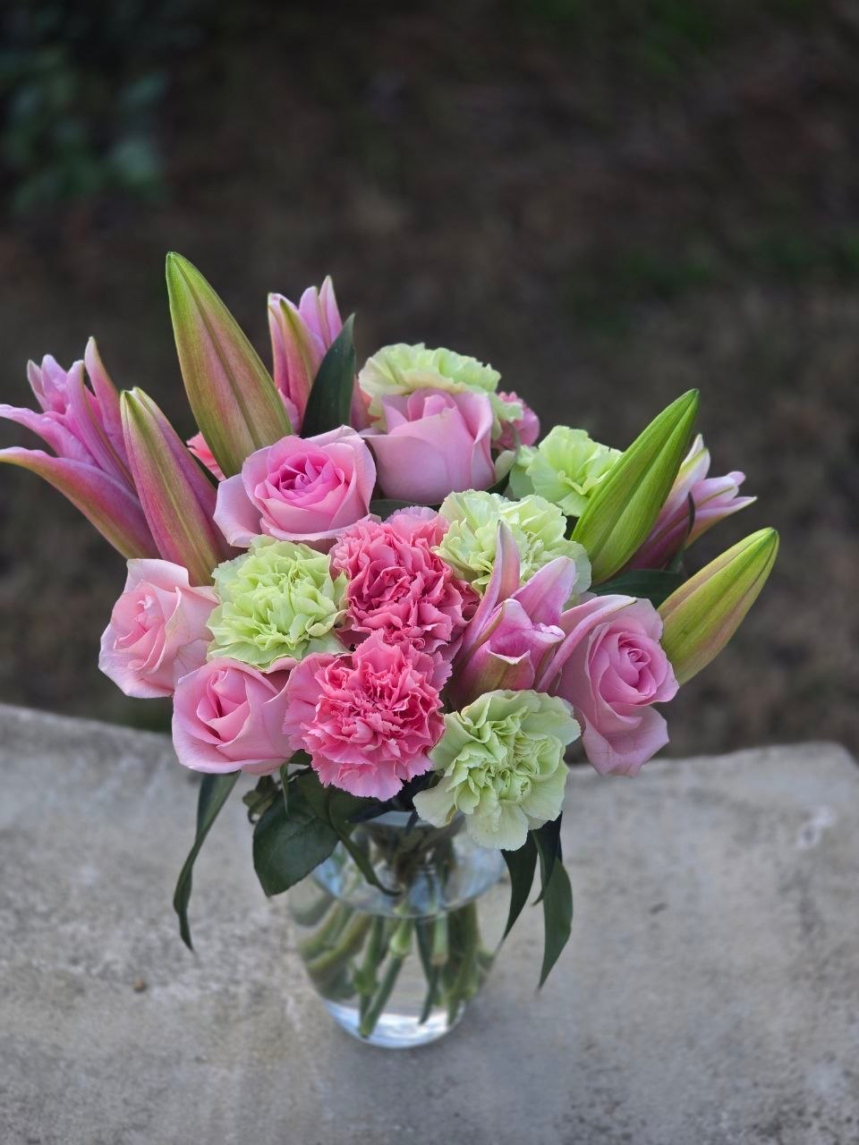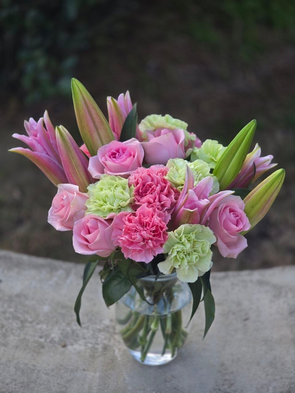 A pink carnation completes the ensemble. Its double petals, slightly serrated, echo the hue of roses and lilies, but with a more subdued quality. The pink carnation symbolizes maternal love, gratitude, and sincerity. It adds volume and texture to a composition, making the bouquet more lush and vibrant.
