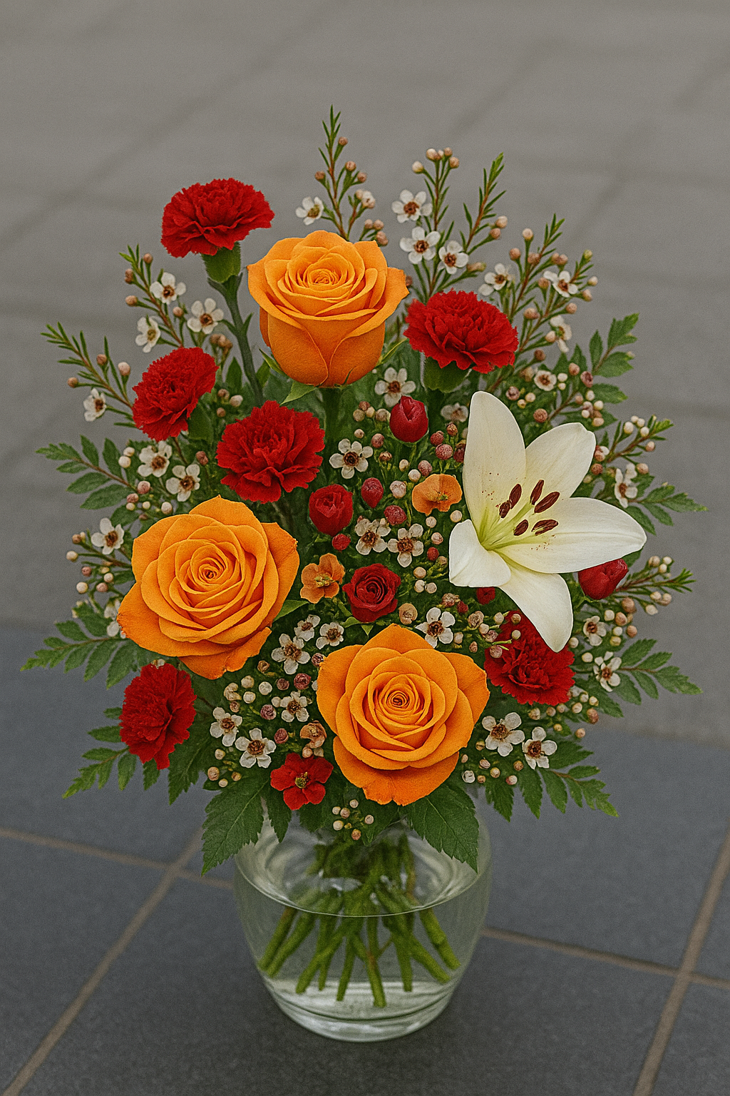 Surrounding the lily are roses — symbols of love, passion, and elegance. Their deep and soft tones create depth and contrast, making the bouquet especially expressive. Carnations add volume and texture to the composition, their ruffled petals looking airy and charming. Their color palette can range from gentle pink to vibrant red, depending on the chosen style.