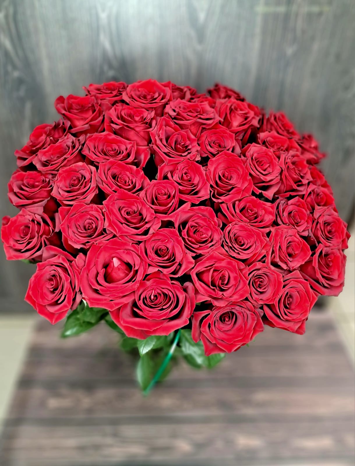 A bouquet of 25 red roses looks impressive and elegant. Red roses symbolize love and passion, with their brightness.  Greenery emphasizes the beauty of flowers, making the composition even more expressive and attractive. Such a bouquet will be a great gift for any celebration or romantic event.