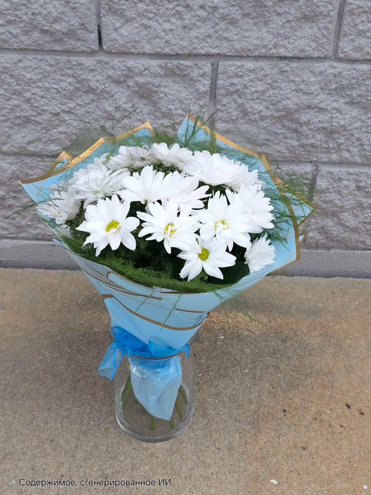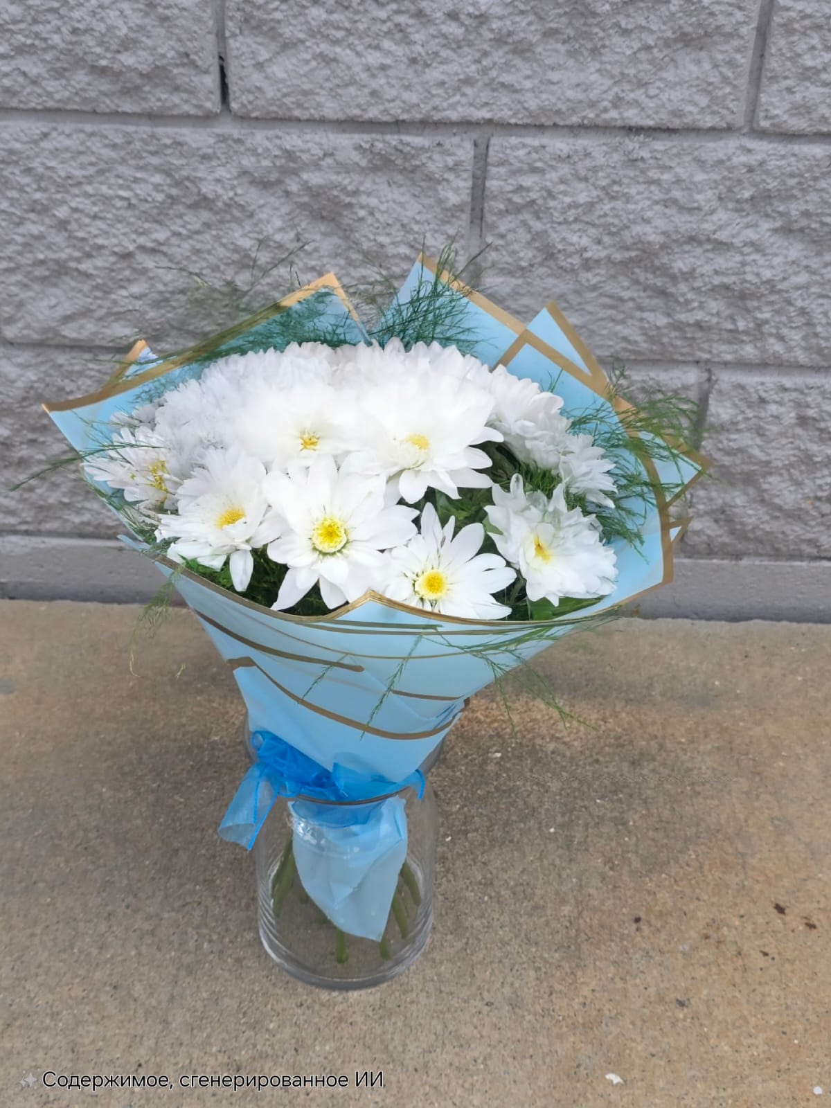 The blue color of the wrapping creates a sense of coolness and calmness, emphasizing the freshness of the flowers and giving the bouquet a modern and stylish look. Blue wrapping pairs beautifully with the white and yellow hues of chamomile chrysanthemums, creating a gentle and harmonious appearance. Additionally, blue is associated with hope, openness, and peace — qualities important to highlight when giving flowers.