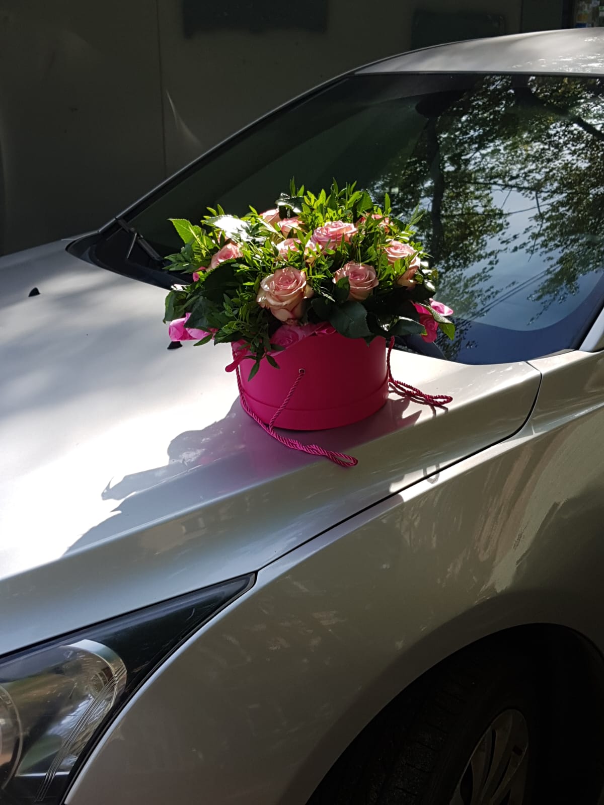 - pink rose bouquet in a hat box