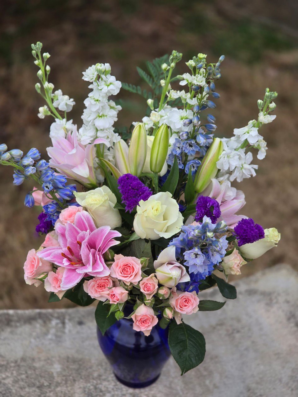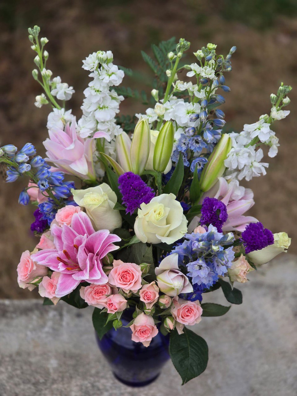 - Delphinium is a vertical accent, lending a special dynamic and architectural quality to the arrangement. Its tall candles with numerous small flowers create a light and airy effect. Delphinium symbolizes openness, friendliness, and a desire for heights, making the bouquet more expressive and memorable.