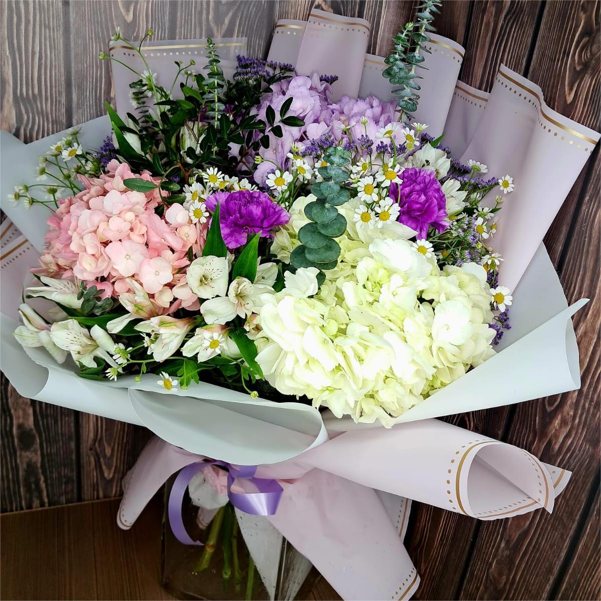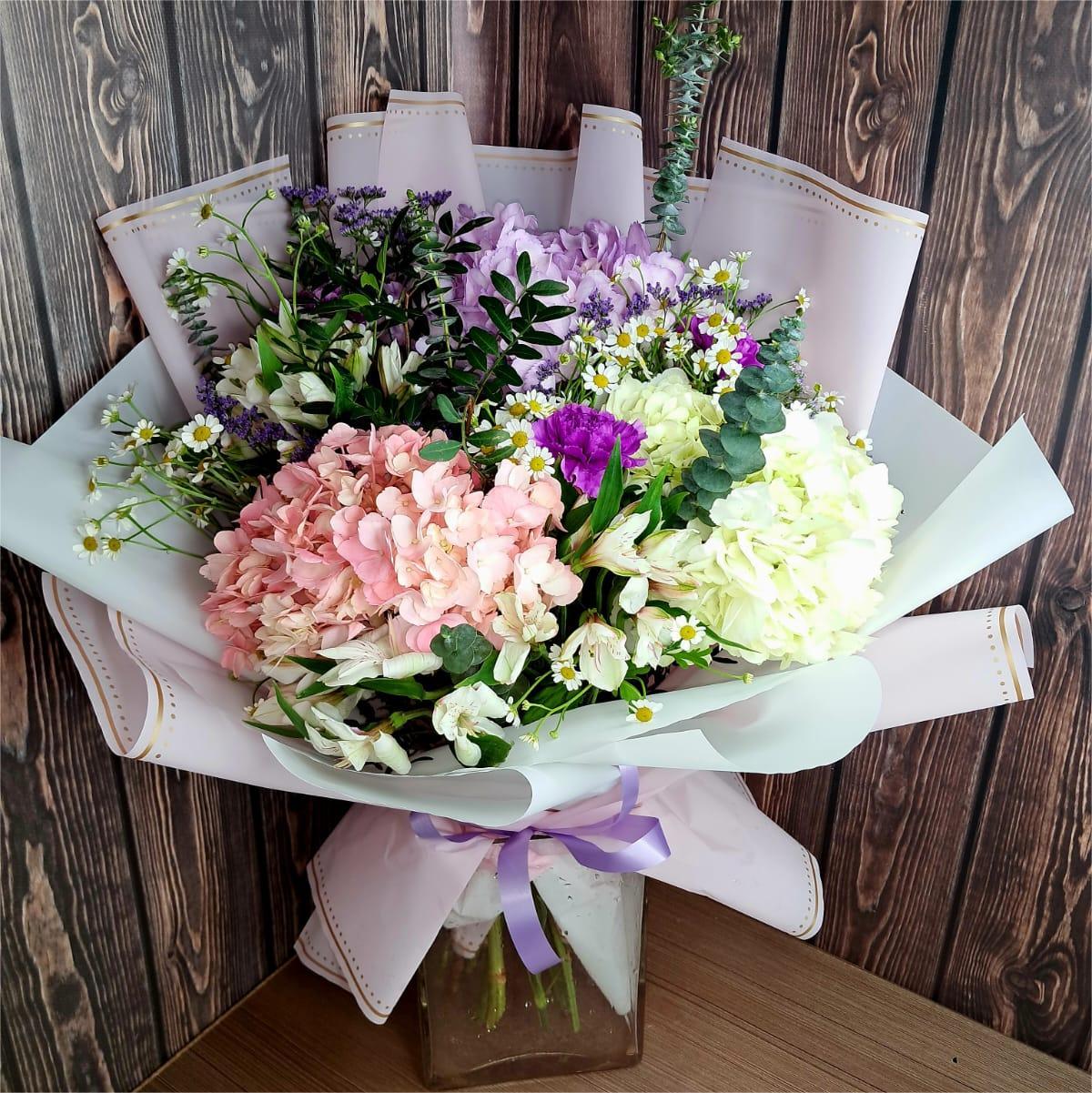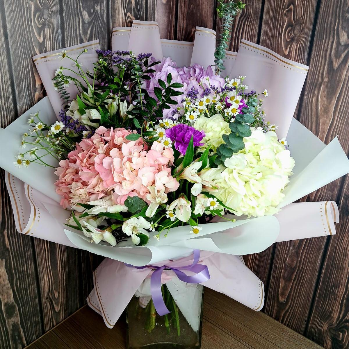 A bouquet in pale pink tones is the embodiment of refined tenderness and romance. It harmoniously combines lush hydrangeas, symbolizing sincerity. Airy alstroemeria with their delicate petals and spray roses, which give the composition charm and versatility. All flowers are neatly collected in a stylish package of pastel shades, emphasizing the natural beauty of the bouquet and creating a feeling of lightness and warmth. Such a bouquet will be an ideal gift for a loved one, mother or friend, expressing the warmest feelings without unnecessary words. Florist bouquet