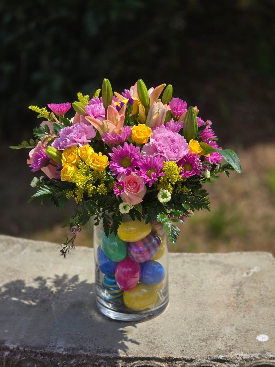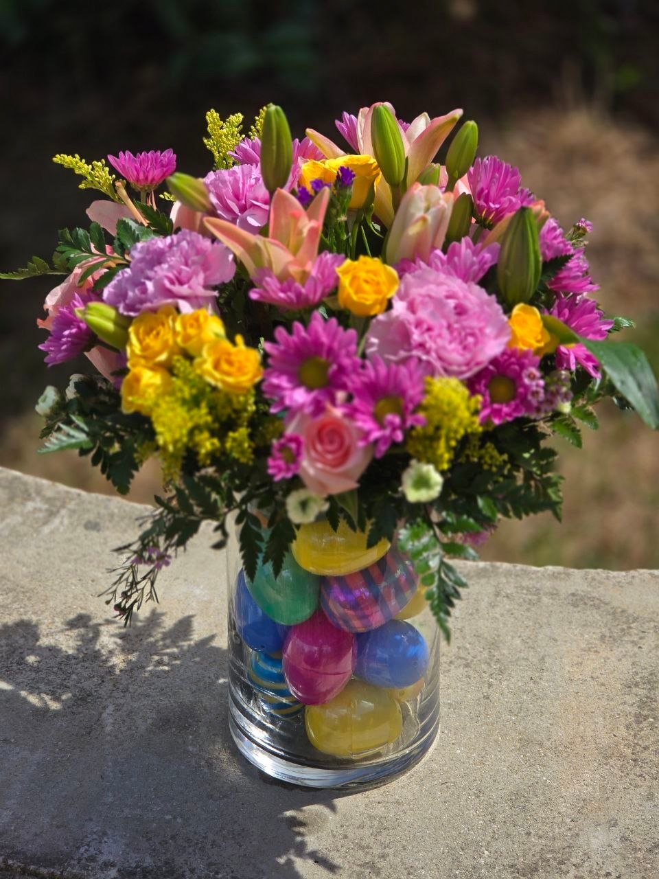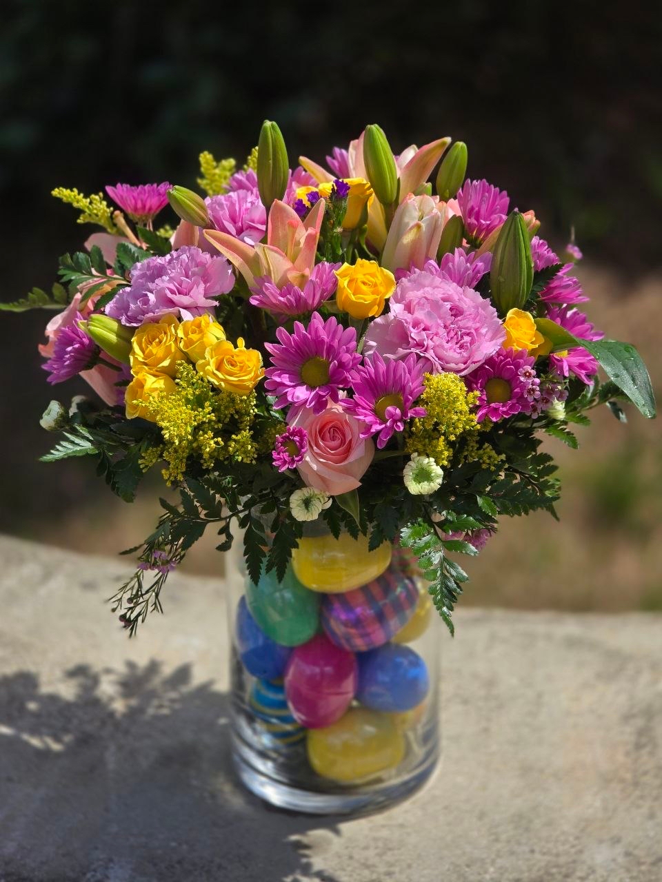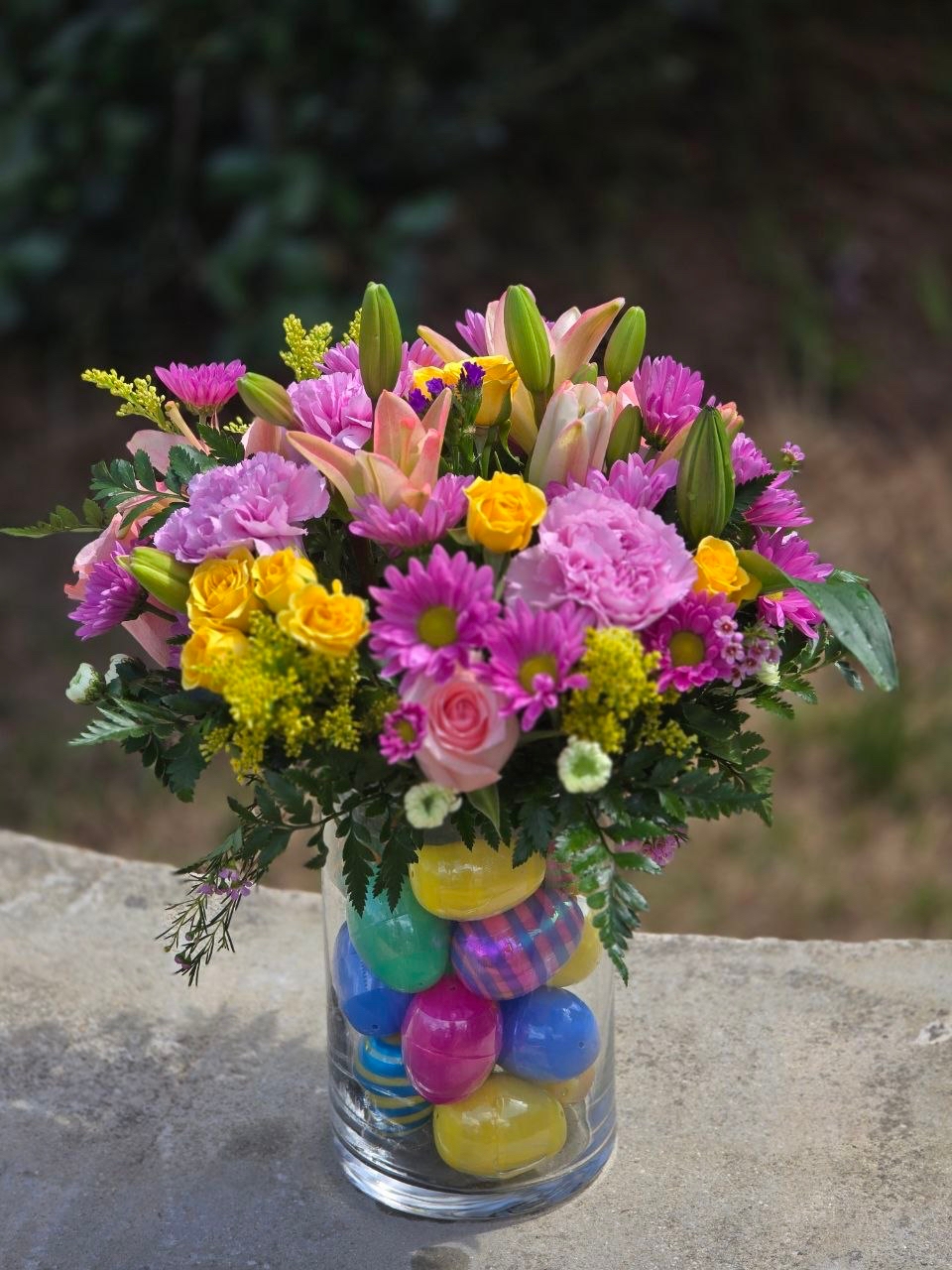 A bouquet in a glass vase filled with plastic eggs is a unique floral arrangement perfect for those wishing a happy Easter or simply gifting a touch of spring spirit.