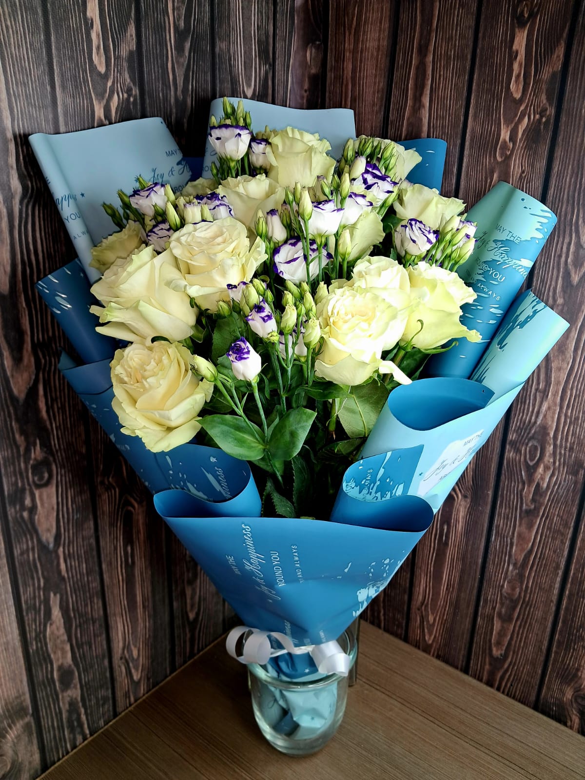 A bouquet in a blue package of heavenly color looks delicate and airy, like a cloud on a clear spring day. The basis of the composition is snow-white roses – a symbol of purity, elegance and sincere feelings. Their velvety petals are harmoniously combined with the graceful flowers of lisianthus, which adds sophistication and lightness.