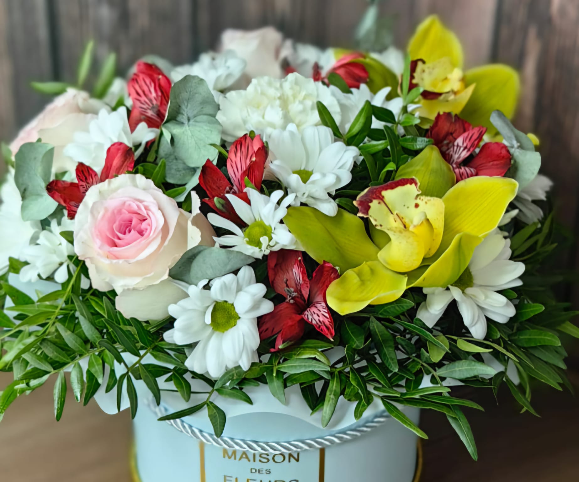 An elegant bouquet in a box consisting of orchids, delicate roses, graceful alstroemerias and lush chrysanthemums, complemented by greenery. This composition combines a variety of shapes and colors, creating a stylish and expressive accent for any business interior or festive occasion.